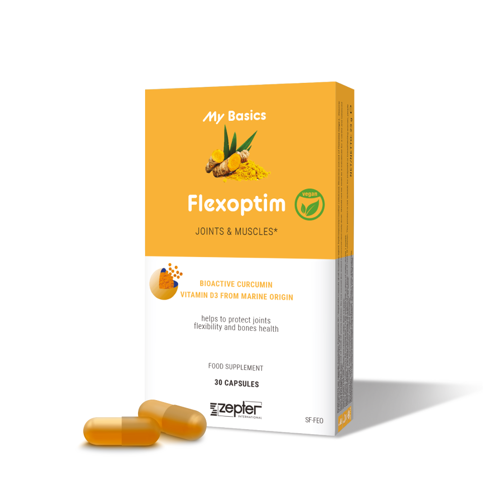 Flexoptim verwendet die Technologie der Bioactive Liquid Micellar Emulsion, um das Curcumin zu lösen und seine Aktivität zu optimieren. Das Rhizom von Curcuma longa ist reich an Curcumin, einem starken natürlichen Antioxidans und entzündungshemmenden Molekül, das der Hauptwirkstoff der Pflanze ist. Flexoptim enthält auch Vitamin D3 marinen Ursprungs (Algen), das zur Erhaltung normaler Knochen beiträgt.