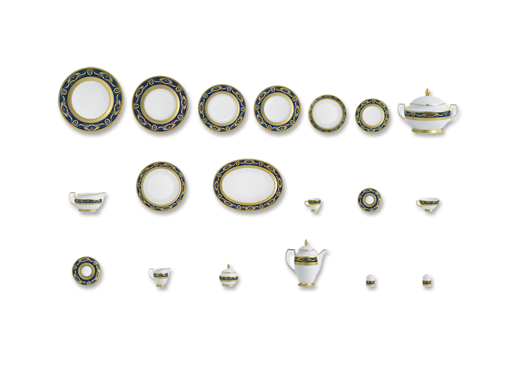 Die Stücke aus der Masterpiece-Porzellankollektion von Zepter schmücken seit mehr als 25 Jahren die Heime der anspruchsvollsten Kunden. Das Porzellan von Zepter spiegelt einen dreistufigen Ansatz wider, der verlangt, dass die Speisen nicht nur gesund und lecker sind, sondern auch auf der Tafel eine gute Figur machen. Nur so können die Gerichte in vollen Zügen genossen werden. In jeder einzelnen Porzellankollektion von Zepter findet sich dieselbe hochwertige Handwerkskunst, die unübertroffene Qualität und die anspruchsvolle Ästhetik wieder, für die das Unternehmen steht. Doch auch vielfältige Stile und ein harmonisches Gleichgewicht zwischen klassischer Kunst und zeitgenössischer Ansprüche sind vertreten. Das 70-teilige Imperial Gold Cobalt-Porzellanservice beinhaltet eine umfassende Artikelvielfalt für jedes Tischgedeck: Servierteller für Abendessen, Suppe und Dessert sind jeweils in zwölffacher Ausführung vertreten. Dieses hochwertige Service setzt sich aus einer Suppenterrine, einer Salatschüssel, einer Sauciere, einem Servierteller, einem ovalen Teller und einem Salz- und Pfefferstreuer zusammen. 12 Kaffeetassen und 12 Untertassen vervollständigen das Set aus Kaffeekanne, Zuckerschale und Sahnekännchen.