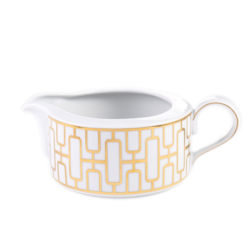 Verleihen Sie Ihren Gerichten den letzten Schliff mit der Regina Gold Sauciere. Diese elegante Sauciere aus feinstem Bone China ist mit einem faszinierenden Golddekor verziert, das an ein Labyrinth erinnert. Das zarte Porzellan und das glänzende Gold bilden eine harmonische Kombination, die jeden Tisch verschönert.