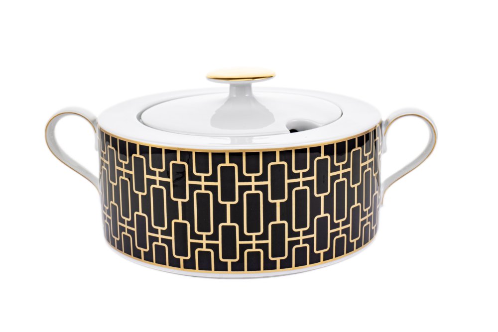 Verleihen Sie Ihren Mahlzeiten eine besondere Note mit der Regina Gold Suppenterrine. Diese elegante Schüssel aus feinstem Bone China ist mit einem kunstvoll gestalteten Golddekor verziert, das an ein filigranes Netz erinnert. Das zarte Porzellan und das glänzende Gold bilden eine harmonische Kombination, die jeden Tisch verschönert.