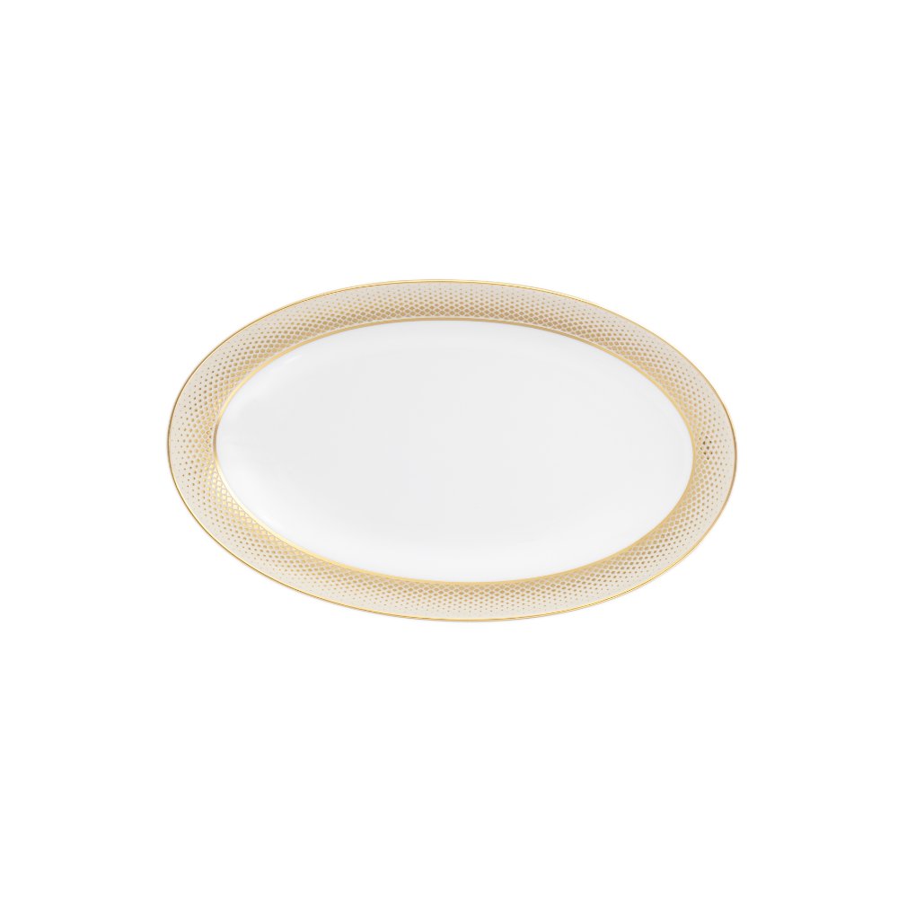 Indulgiere in die Schönheit und Funktionalität der Rio Gold Ovalen Platte. Diese 24 cm große Platte aus feinstem Porzellan ist mehr als nur ein Geschirrteil – sie ist ein Kunstwerk. Das faszinierende Golddekor, das sich wie ein Labyrinth über die Oberfläche schlängelt, verleiht Ihrem Tisch eine besondere Note.