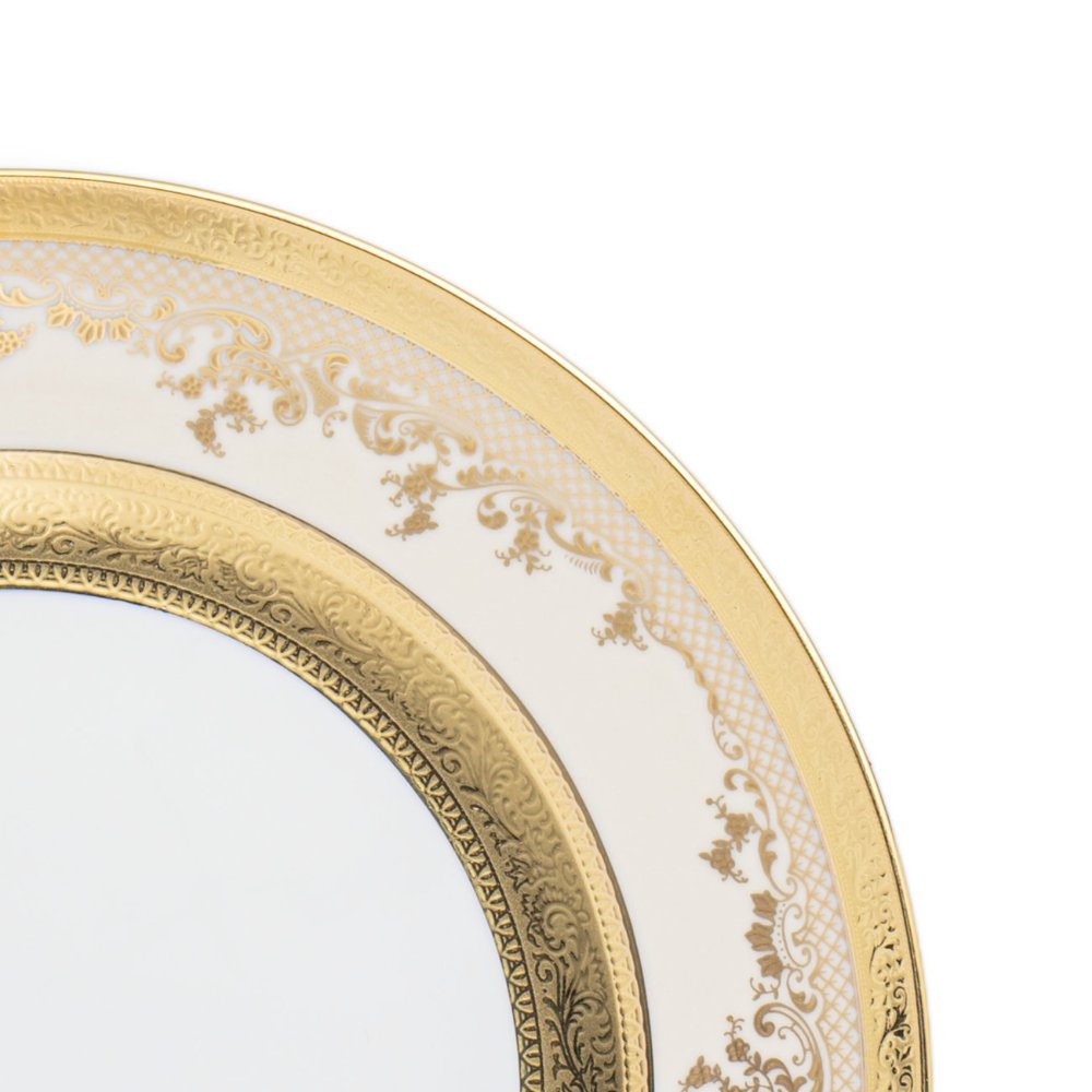 Krönen Sie Ihr Menü mit dem Royal Gold Creme Dessertteller. Dieser 22 cm große Teller aus feinstem Bone China ist die perfekte Wahl für süße Verführungen. Das sanfte Cremeweiß des Porzellans bildet einen edlen Kontrast zu den dezenten Goldakzenten, die dem Teller eine luxuriöse Note verleihen.