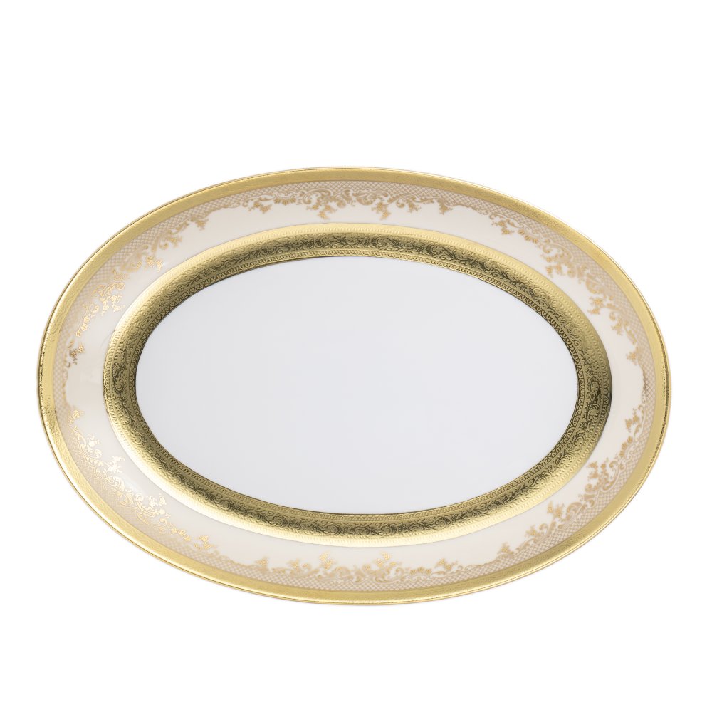 Erleben Sie königlichen Genuss mit der Royal Gold Creme Ovalplatte. Diese 35 cm lange Platte aus feinstem Bone China ist ein Meisterwerk der Porzellankunst. Das sanfte Cremeweiß des Porzellans bildet einen edlen Kontrast zu den dezenten Goldakzenten, die der Platte eine luxuriöse Note verleihen.